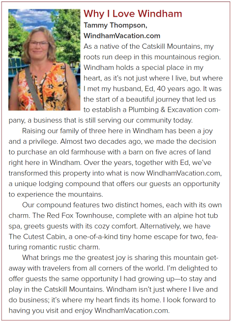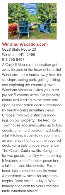 September 2023 - We are so pleased to be included in the October 2023 issue of this wonderful local guide. It shows of all of the best things that Windham and the Catskill Mountain Region has to offer. Find us by clicking on the images below. Better yet, come visit us and check out our terrific Red Fox Townhouse and, of course, the Cutest Cabin! We look forward to meeting you .... Tammy